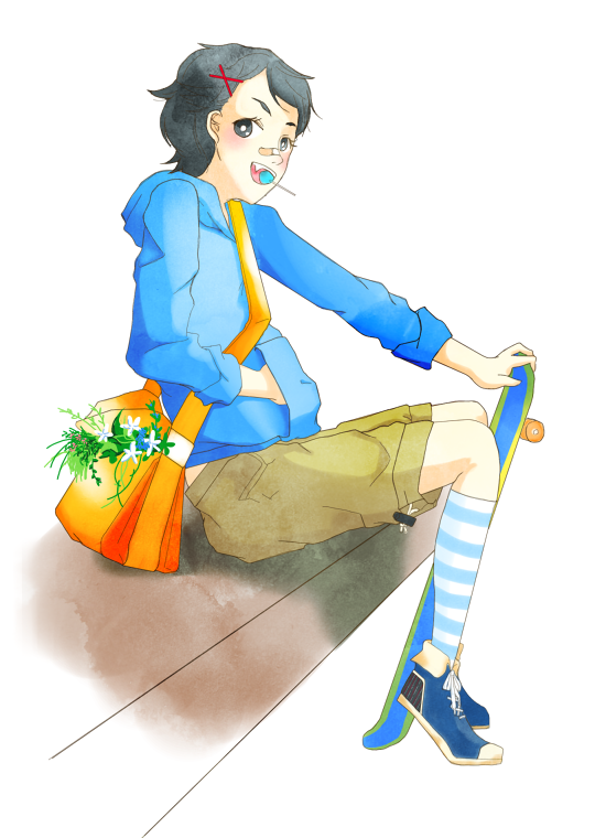 キャラ詳細「身長は低め・痩せ気味・年齢は17くらい・おっぱいはぺたんこ!」 キーワード「鼻の頭に絆創膏・髪の毛は黒髪でショート・パーカー・スカート嫌い・運動大好き頭は悪い・青系の色が好き・甘いもの大好き」