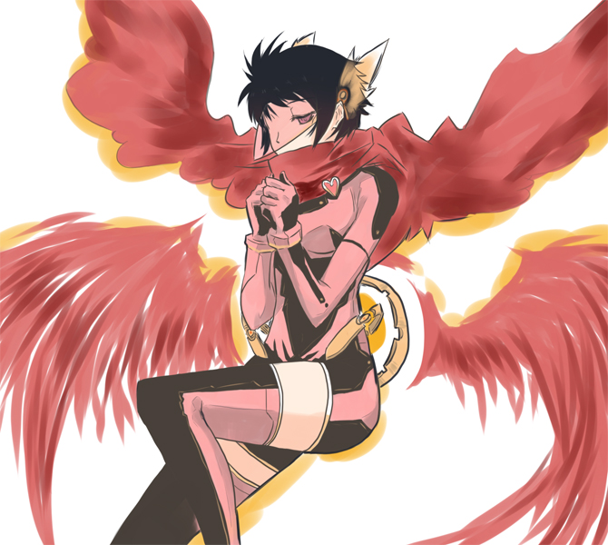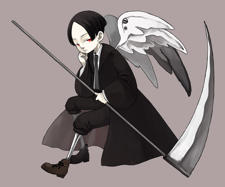 性別♂ 14歳ぐらい 細身 KW:【黒髪ショートカット ジト目で色は赤色 偽翼 ダボダボ袖 人形みたいな表情 大きい鎌を持っている 几帳面っぽい】