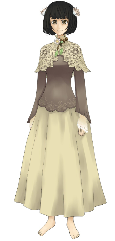 女性/体格:むちむち/年齢:18くらい KW:黒髪ぱっつんAライン内まきボブ/生成り色/レース/裸足/植物/やわらかい表情/ロングスカート