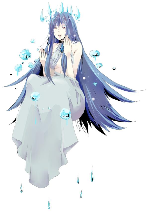 20歳前後・女性・やせ・おっぱい大きめ・160cm KW:【色白・青髪ロングストレート・布を巻いたような服・浮いている・儚げ・赤目・溢れ出す水】