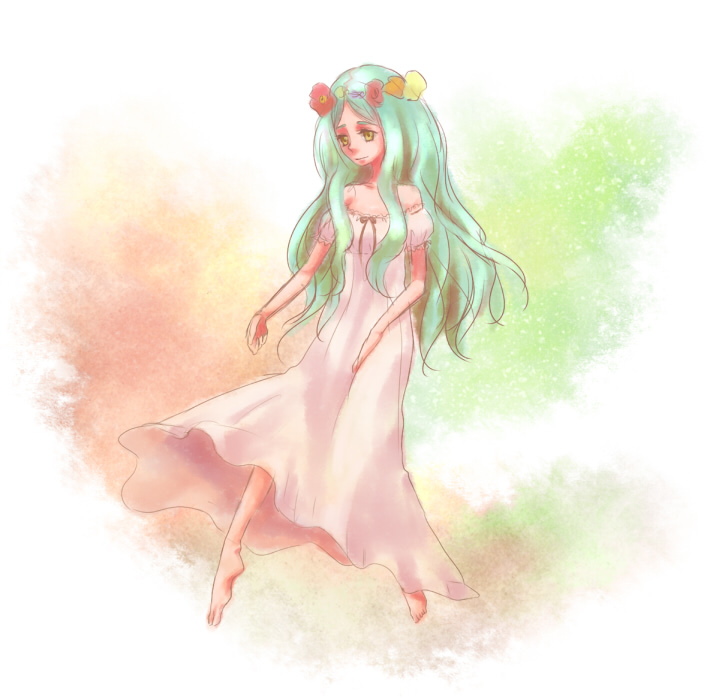 http://twitpic.com/qimvx外見:20代後半・女性・小柄・華奢 KW:ふわふわロングヘア・緑髪・パフスリーブのドレス・花冠・細いリボン・眠そう・おっとり